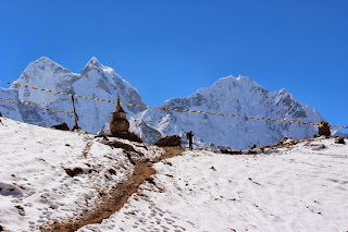 A partir del 20 de octubre la tónica cambió, los 4.000m se sentían a cada paso. Nuestra llegada a “Dingboche” nos mostraba en realidad la intensidad de la nevada de los últimos días. A los lados de nuestra posada las montañas se levantaban haciéndonos sentir inmensamente pequeños. El frío nos hacia reunirnos desde temprano en el comedor transformándolo en una pequeña Babel en la que personas provenientes de los más diversos lugares del planeta conversaban en diferentes idiomas temas relacionados al mismo tópico… las montañas.