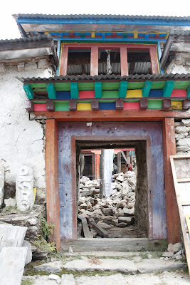 El día de ascenso a “Pangboche”, lo iniciamos como de costumbre, alrededor de las 8:30 de la mañana. La intención era pasar visitando el antiguo templo de “Deboche”, que estaba en pleno proceso de reconstrucción. Al iniciar la marcha nuevamente coincidimos auspiciosamente con el “Rimpoche” que realizaba su caminata matutina por los bosques de rododendros de “Deboche”. Los estragos del terremoto podían verse a lo largo de todo el camino, disimulados en gran parte por la actitud alegre y esperanzadora de todos los habitantes del Khumbu. En el caso de la “Gompa” (Templo) de “Deboche”, este se encontraba totalmente destruido, afortunadamente en pleno proceso de reconstrucción. En efecto, el terremoto había sido inclemente con las construcciones más antiguas… y este templo era uno de los de más vieja data de todo el Khumbu.